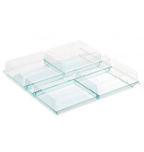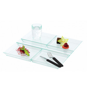Tray with frosted bottom and 5 compartments. The central part holds cutlery, glass or accessories (max. Ø 50/55 mm: CPS16 , 15 cl). It can be completed with a transparent partitioned lid AC310 which isolates each compartment: - 4 compartments: 155 x 130 mm - 1 central space: 310 x 50 mm Made in France.