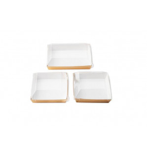 Prix €29.00 HTConditionnement : 200AKN6Plate in kraft cardboard, with white PET inner coating. Suitable for oven and microwave. These kraft plates come in 3 sizes: - AKN6 : 65 x 130 x h 30 mm and lid ACC6 - AKN13 : 130 x 130 x h 30 mm and lid ACC13 - AKN18 : 180 x 130 x h 30 mm and lid ACC18 The Cubik range of plates is also available in crystal or black PS, bamboo, wood and bagasse. -