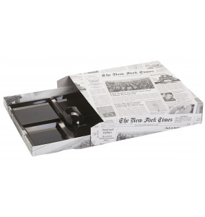 Prix €186.30 HTConditionnement : 100CNS30Multi-purpose square box in newspaper-style printed cardboard. Comprising a tray to slide inside (h30 mm) and a case, it's ideal for delivering a brunch, a meal or mignardises for a shared event. It is compatible with all our ranges of tableware and trays. -