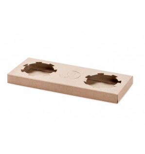 Price €55.00 VAT excl.Unit per box : 50BKB33Multi-purpose cardboard box with fold-down handle for safe transport. Fits the CBK31 wedge, for 2 containers + 1 glass: - 2 multi-container perforations Ø82 to Ø97mm. - 1 pre-punched hole Ø55mm for 1 glass or 10 cl cup. Made in Europe and recyclable. -