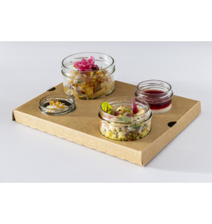 Price €24.10 VAT excl.Unit per box : 50CBKW29Kraft cardboard wedge to fit our 5, 15 and 45 cl Woodboxes, with or without lid. It has 4 pre-cuts: Ø122mm, x2 Ø87mm and Ø57mm. For transport, it can be placed in the Bokobox BKB27 . This wedge with four Woodboxes is available as a 1 or 2 person meal option, YFO12 or YFO13 . -