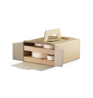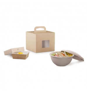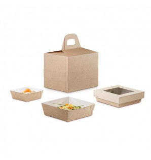 Prix €242.70 HTConditionnement : 100YFO31 Bento box in kraft cardboard 175x175xh150 mm CBK17 3 1-liter trays in kraft/cellophane cardboard 160x160xh50 mm BNK160 -