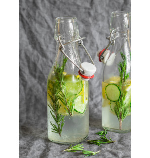 Prix €154.00 HTConditionnement : 120MLM12Mini 12 cl glass lemonade bottle with traditional white stopper and orange rubber seal. Easy to take away and attractive on a reception table. It's a fun way to present drinks with a straw as an accessory. Reusable and recyclable. -