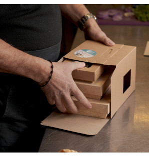 Kraft cardboard box with two side openings and a fold-down handle for carrying up to 4 stackable plates: