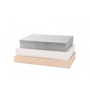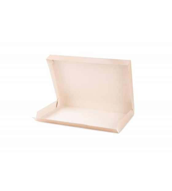 Beige cardboard catering case with white interior, ideal for transporting pastries, appetizers or serving trays, especially our black non-slip tray PN42