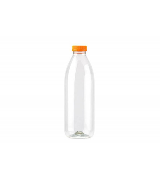 Transparent, lightweight bottle with orange screw cap (packed separately, included in each carton). Screwed onto the bottle, the cap anchors itself to the neck and becomes tamper-proof. It remains attached once opened. Suitable for takeaway or delivery. Available in 3 sizes: 25 cl JUS25, 50 cl JUS50 and 100 cl JUS100.