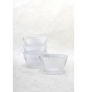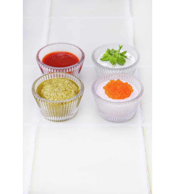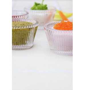 This 5 cl cup with its flared design is inspired by the pleated paper used in patisserie. It's ideal for presenting mignardises or arranging a few colorful sweets. Made from highly resistant pressed glass, it is reusable.