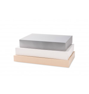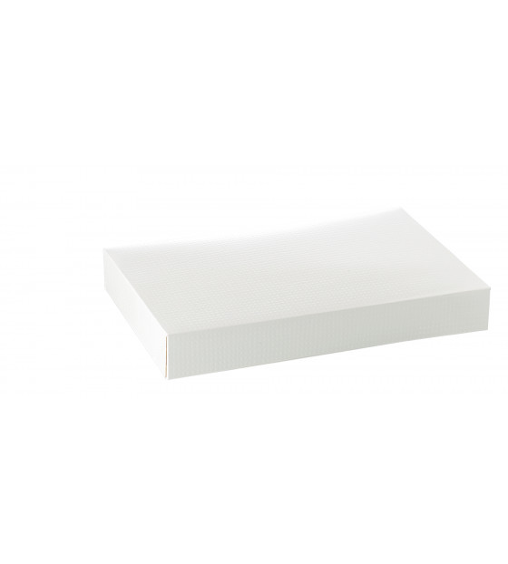 Luxe white catering box in lightly embossed cardboard, ideal for lunch or dinner cocktails.