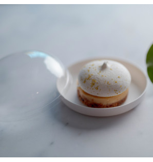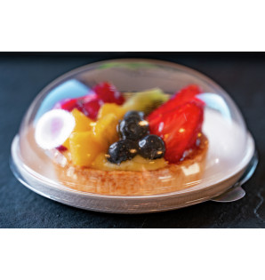 Transparent dome lid, suitable for Ø120 mm Santo plates. Attached to the plates, it allows safe transport of all types of culinary creations. With a height of 4.5 cm, food is protected and perfectly visible. This lid, made from recycled materials, is recyclable.
