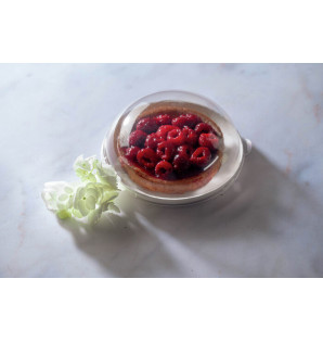 Transparent dome lid, suitable for Ø160 mm Santo plates. Attached to the plates, it allows safe transport of all types of culinary creations. With a height of 4.5 cm, food is protected and perfectly visible. This lid, made from recycled materials, is recyclable.