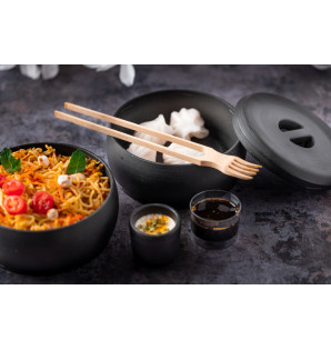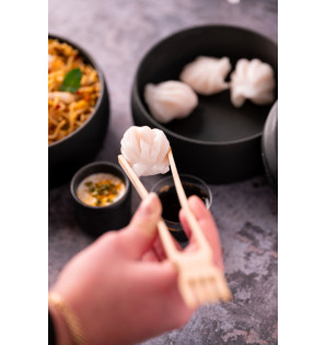 2-in-1 bamboo cutlery, both chopsticks and fork, very practical for enjoying Asian preparations without apprehension! Its large size means it can be used in deep containers such as the PFK48, the PS475 or the MBN40. Height of chopsticks 170 mm and 4-prong fork 30 mm. Individual transparent packaging guarantees perfect hygiene.