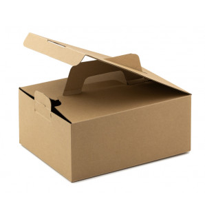 Sturdy, practical kraft cardboard box with top opening. With a fold-down handle, it can be stacked. This makes it easy to prepare and store take-away meals in advance. Delivered flat-packed, it's easy to assemble thanks to its automatic bottom.