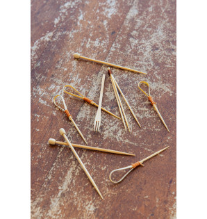 Mini bamboo fork, very fine and delicate. It can be used as a spade for your cocktails or for take-away. Also available in large format FGB140.