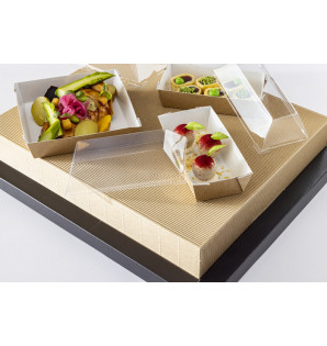 The Cubik range of plates is also available in crystal or black PS, bamboo, wood and bagasse.