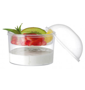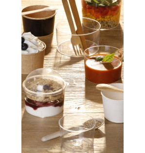 Both an insert and a dome lid in transparent rPET (recycled and recyclable), it fits the BDG30 30cl Bodeglass. This solution is ideal for creating dessert or brunch duos: yoghurt with muesli/fresh berries/granola, salad with vinaigrette, soup with croutons.... Made in France, it is recyclable.