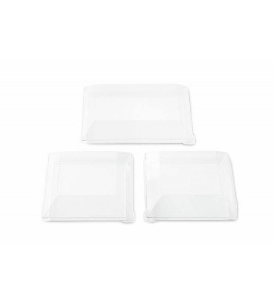 Cubik tableware set in transparent PS with RPET lids (h30 mm), consisting of: - 1 plate 180x130 mm ACU18C and lid ACC18 - 2 plates 130x130 mm ACU13C and lids ACC13 This kit fits our Thema meal trays, and is also available is also available in black PS KITVBN