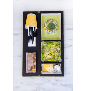 Luxor cutlery set in high-quality black PS, comprising a fork, knife, spoon, napkin, salt & pepper. With their contemporary, they are pleasant to use, washable and reusable.