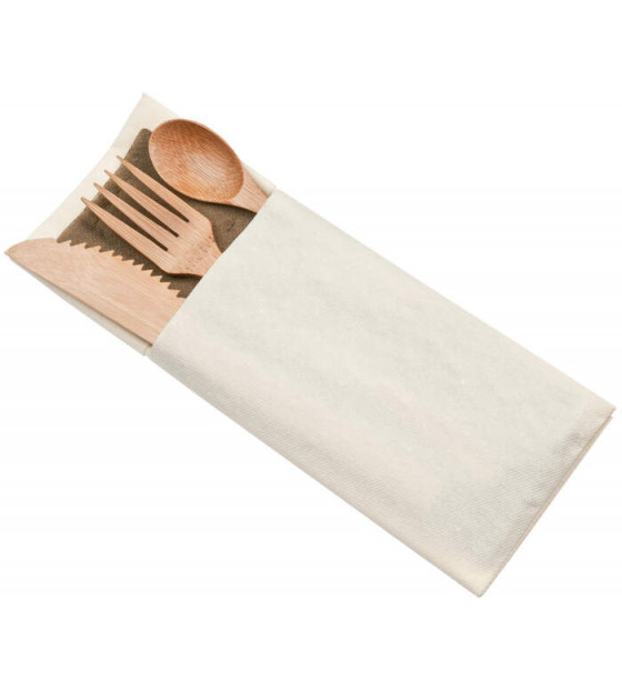 Set of 5/1 pieces of Premium Bamboo cutlery, finished with a food-safe varnish. High quality, they are perfect for your top-of-the-range takeaway formulas. The Premium Bamboo cutlery kit includes: - Knife: CBB17, 170mm - Fork: FBB17, 170mm - Dessert spoon: PCB15, 115mm - 1 non-woven paper napkin 38x38cm - 1 non-woven paper place mat 40x32cm Cutlery is available in bulk KBA300 and in kits: KBA312, KBA412, KBA612