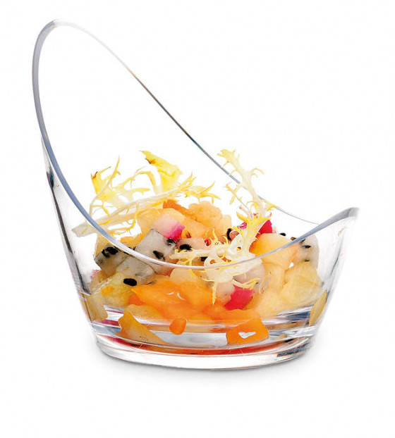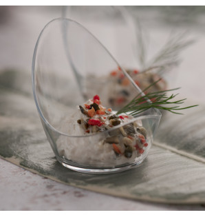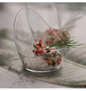 3-cl mini verrine with a raised spoon-shaped rim. Its unique design will add a touch of elegance to your presentations. Made from transparent PS, it is reusable and recyclable.
