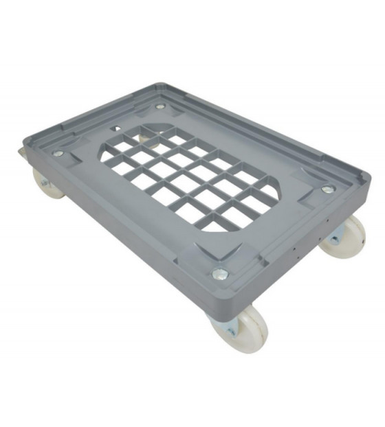 Euronorm rolling dolly in grey PP. Suitable for 600x400 and 400x300 mm bins. Height: 160 mm. Load capacity 250kg. It has no brake or lock to stop the swivel wheel from rolling, for free and unconditional movement.