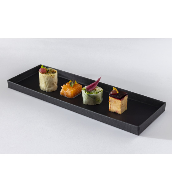 Top-of-the-range Atlas 1/4 tray in black cardboard with straight edges. Its satin-finish surface and textured exterior give it a refined, high-end design. For perfect hygiene and safe transport, it comes with a transparent lid (h40 mm) CPL27. Suitable for food contact.