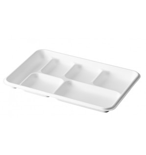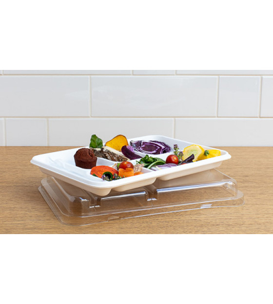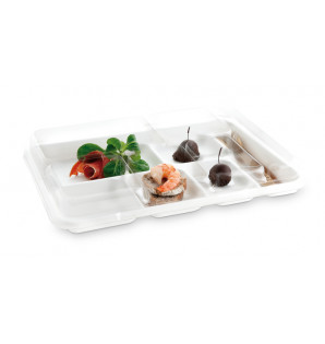 Bagasse meal tray with 6 compartments, including 1 side compartment for cutlery, glass or accessories. It can be fitted with a recyclable transparent lid CPF6R , for perfect visibility of its contents. The base can be used in the freezer, oven or microwave. The Snack 6 tray is an economical solution for meals to be delivered (to local authorities, schools, businesses, etc.).