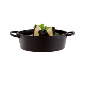 Mini round black plate with handles, egg plate style, holds 13 cl (Ø90 mm without handles). Made from microwaveable PP, it can be frozen. Reusable and recyclable.