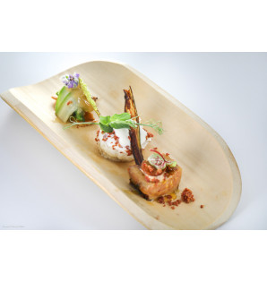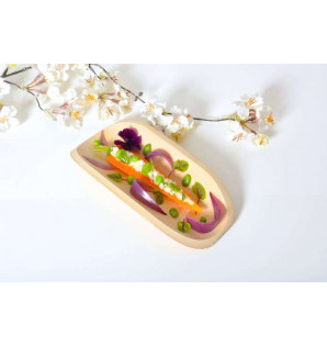 Rectangular mini tray (21x9 cm)made from thick, hard-wearing natural bamboo. It can be used as a tasting plate to give a natural character to your presentations.