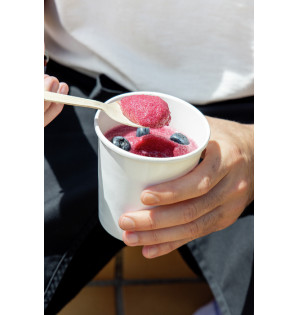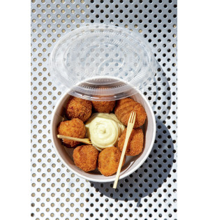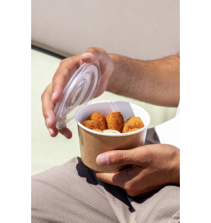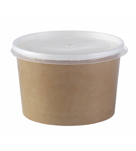 Hot-liquid and grease-resistant cardboard/PE takeaway jar with microwaveable PP lid. Designed for hot filling (liquid up to 100°C) and serving within the hour.