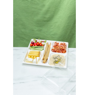 Square bagasse meal tray with 5 compartments, including a central one for cutlery, glass or accessories. It can be closed with two styles of lid, 4.5 cm high, to divide each compartment: in bagasse QC310 or transparent rPET AC310 . A kraft cardboard ring keeps the tray closed and makes it safe to transport BQK9