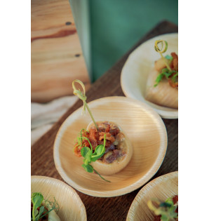 Round mini ramekin made from palm leaf sheath. This 100% natural material, with no treatment or additives, is waterproof and heat-resistant: oven and microwave safe. Ideal for adding a natural, exotic touch to your buffets, we offer a range of palm leaves: