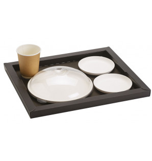 Cardboard base for the Thema meal tray, to be combined with a lid in different colours: apple green CTHVP, vanilla CTHVA, tangerine CTHM, kraft CTHK, fuchsia/black CTHF or white with window CTHF100. The tray can be completed with one of our Cubik crockery kits, with or without lid.