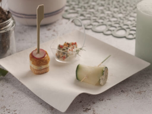The Cubik plate range is also available in wood, bagasse, cardboard/PET, and PS.
